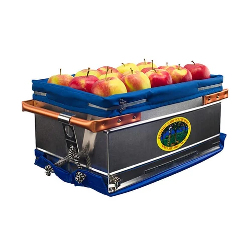 Zaboj za obiranje iz Al pločevine z ojačanimi robovi in z notranje strani oblečen v robustno platno in podložen s peno, za preprečitev poškodbe plodov.