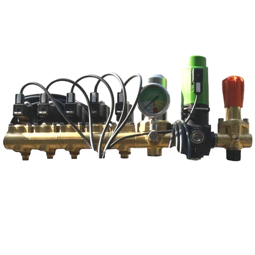 Membranski električni ventili v kompletu s tlačnim filtrom in električnim regulatorjem tlaka, ter ročnim regulatorjem tlaka za nastavitev maksimalnega tlaka. S petimi izhodi. S komandno omarico za upravljanje iz traktorske kabine.
