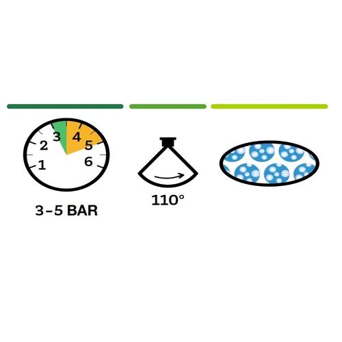 Dysze wlotu powietrza (system Venturi): rozpyla duże krople wypełnione bąbelkami, które są odporne na znoszenie i rozpadają się na mniejsze kropelki w kontakcie z rośliną. Prawie całkowicie zapobiega znoszeniu, zwiększa się liczba kropli na roślinie (doskonałe pokrycie rośliny)